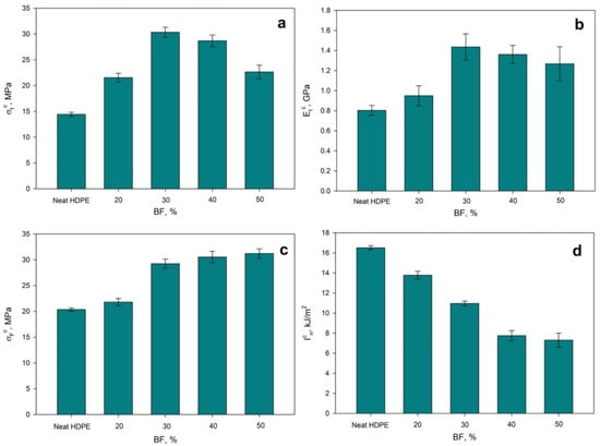 As observed in Figure 4, the incorporation of BF had a positive effect on the tensile strength of HDPE composites up to 30 wt% of reinforcement content. However, higher contents of BF slightly decreased the tensile strength. This was attributed to BF agglomeration or bad dispersion, which probably resulted in weak points for fracture initiation [] and poor interphase between both constituents as well. The same behavior was observed for the Young’s modulus.