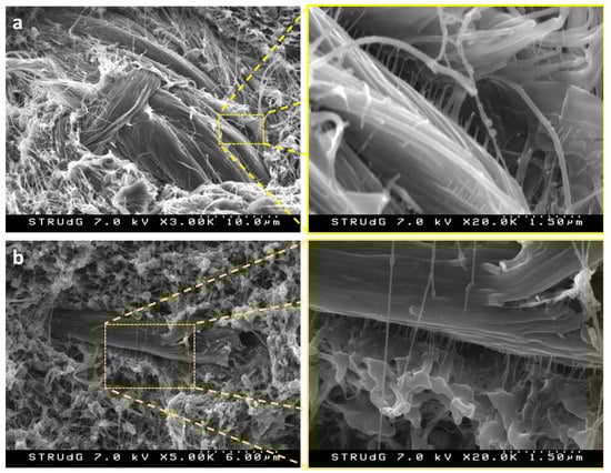 Scanning electron microscopy (SEM) images of 30 wt% (a) and 50 wt%; (b) BF-reinforced HDPE composites at different magnification.