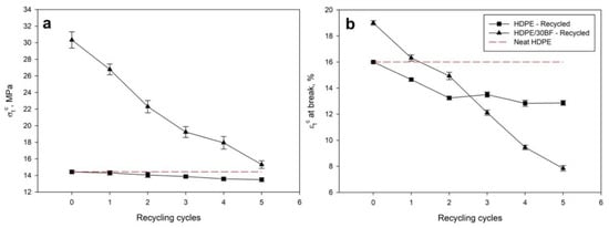 Effect of successive recycling cycles on tensile strength at break (a) and elongation at break; (b) of HDPE and HDPE composites.