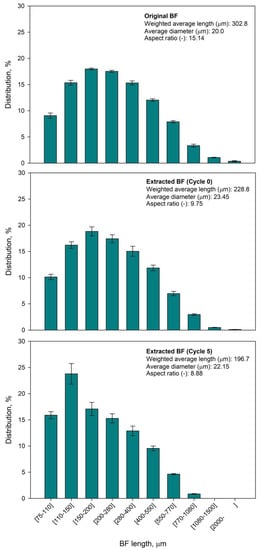 As can be seen in Table 2, both the compounding and injection molding processes significantly affected the length of the BF fiber. This is in line with the results that have been already reported by several authors in the case of lignocellulosic fibers, where the effects of processing the composites negatively affect the potential mechanical performance of the material [,], influencing as a rebound effect the environmental performance []. Indeed, when comparing the fiber length distributions of the extracted BF after the cycle 0 with the one from cycle 5, a clear shift to the left of the graph can be observed (Figure 7).