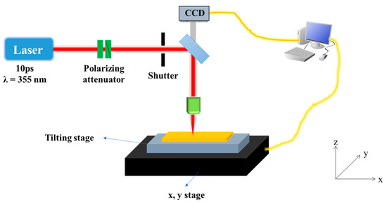 The configuration of the laser processing system used in this study is shown in Figure 1. The polymer samples were placed on a tilting stage, which could be adjusted to an optimum position to avoid unequal vertical displacement over the range of the sample surface from the focal plane during laser irradiation. The tilting stage was then placed on a movable dual axis x-y stage, and checked for no vertical displacement during lateral movement. For our experiments, we used an Nd:YVO4 picosecond (ps) pulsed laser with a pulse duration of 10 ps, wavelength of 355 nm, and repetition rate of 50 kHz to 500 kHz (time bandwidth). The pulse repetition rate was set by referring to the specifications provided by the laser manufacturer. In this experiment, the laser beam was irradiated in a direction perpendicular to the sample using an objective lens (Mitutoyo) with 10× magnification, 0.28 numerical aperture (NA), and 20 mm focal distance. When the focal plane was located on the top surface of the sample, the diameter of the laser beam was calculated to be approximately 1.2 μm by the following Equation (1) [38]:
