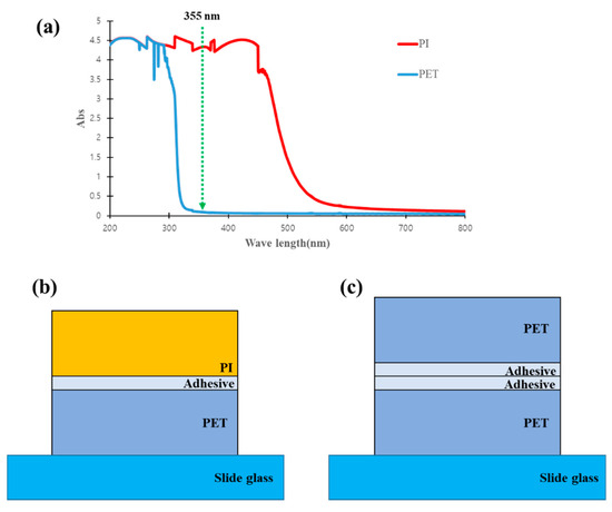 (a) Absorption spectrum results for two types of polymer materials using UV–Vis spectrophotometry and configuration of the samples prepared for the experiment: (b) polyimide (PI) and (c) polyethylene terephthalate (PET).