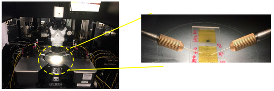 Previously, we discussed the SEM and optical microscopy observations corresponding to PET and PI processed using different laser parameters. In this section, measurements were conducted to verify whether the blackened scan line that was irradiated by the laser and the porous surface structure in PI corresponded to carbonization. To evaluate these changes, the electrical characteristics of laser-processed PI were measured using a probe station, as shown in Figure 3. The probes were placed at two points on the laser-irradiated scan line and the electrical resistance of the sample was measured.