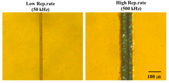 As discussed above, the morphological characteristics, such as laser-induced ablation and collateral damage, caused by the two conditions of laser power, were compared in this study. For the laser power used in this experiment, a value higher than the damage threshold fluence was selected, based on previous research, to be 0.8 μJ (70 J/cm2) for the same pulse energy. Furthermore, the same average power of 0.4 W was applied, for each pulse repetition rate, at a fluence of 700 J/cm2 (50 kHz) and 70 J/cm2 (500 kHz), respectively.