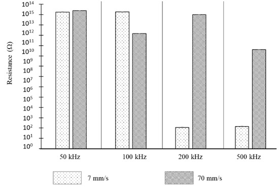 We did not measure the electrical resistance of PET because it did not exhibit morphological change, which is assumed to be a result of carbonization or graphitization. Furthermore, the electrical resistance of only those PI samples processed by a scanning beam was measured (Figure 9). The electrical resistance of the PI sample without any processing was several GΩ. The measurement results of the laser-processed sample (in the case of a high scan speed (70 mm/s)) indicated almost no difference compared to the results before laser processing for each pulse repetition rate. However, at a slow scan speed (7 mm/s), completely different results were observed depending on the pulse repetition rate. Although the resistance at low repetition rates (50 and 100 kHz) was not very different from that of the unprocessed sample, at high pulse repetition rates (200 and 500 kHz), a significant difference could be observed. In this case, it can be seen that the electrical resistance of the processed samples decreased significantly.