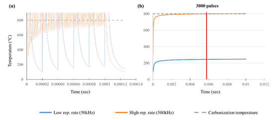 We used Equations (3) and (4) to analyze temperature behavior due to residual heat in PI subjected to laser processing at high and low pulse repetition rates. In this case, ηHeat was assumed to be a constant. The obtained results are shown in Figure 11. In this figure, the x-axis represents time and the y-axis represents temperature; the blue line indicates the results related to the low pulse repetition rate while orange lines indicate the results at a high pulse repetition rate. Meanwhile, the gray dashed line indicates the carbonization temperature of PI. In Figure 11a, when one laser pulse is irradiated, the surface temperature increased due to interaction between the material and laser. The heat generated is dissipated by thermal conduction in the material during the dwell time between pulses leading to cooling in the irradiation area. This cooling continues until the next pulse is irradiated. When the next pulse is irradiated during cooling, the temperature increases once again. The lowest temperature before the temperature is raised by the next pulse is plotted by the spiked line. At a low pulse repetition rate, five spikes appeared, but this number increased to 50 at a high pulse repetition rate. This number corresponds to the number of pulses used; the obtained spike-point temperature is called the baseline temperature, which maps the rise in temperature (residual heat) with respect to the number of repeated pulses. The plot was re-drawn as shown in Figure 11b using the baseline temperature and extended to include pulses, 500 pulses in the case of the low repetition rate and 5000 pulses in the case of the high pulse repetition rate.