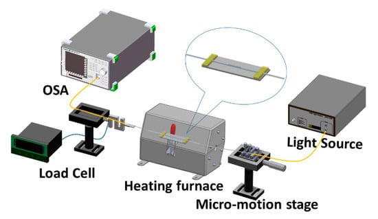 For this test, one end of the LLPFG sensor, which had been fabricated through laser-assisted etching, was connected to an optical spectrum analyzer (OSA) (Anritsu, MS9710C, Kanagawa Prefecture, Japan); the other end was connected to a superluminescent diode. These two ends were then secured to the micromotion stage and load cell; the horizontal positions of the micromotion stage and load cell were then adjusted. Tensile testing was conducted by manually rotating the micromotion stage such that an axial force was created to stretch the sensor. The tensile force was increased at increments of 0.0098 N, and the changes to the OSA’s wavelength readings were observed, with a waveform rebound indicating that the sensor’s optimal sensitivity had been reached. The experimental scheme is illustrated in Figure 3.