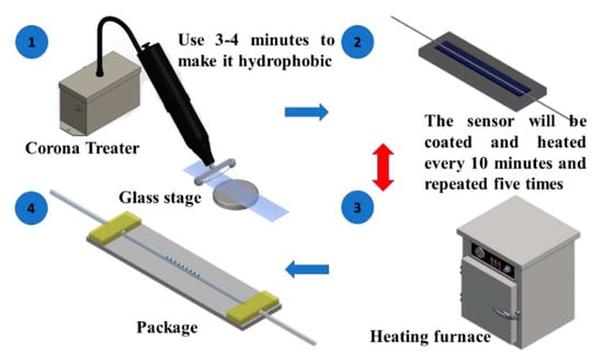 During the encapsulation process, the LLPFG sensor was placed above a glass dish, and a corona treater was used was to induce a gas breakdown; specifically, a dissociation reaction was achieved by using the corona treater to perform a tip discharge at the upper section of the sensor structure such that a concentrated electric field was formed at the tip. After the aforementioned process had been completed, the sensor was placed in a cubic quartz cell where it was then coated with PEDOT:PSS.