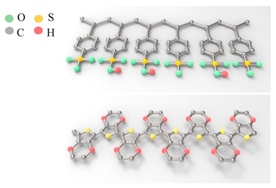 Figure 5 presents a schematic of the molecular structure of PSS. PEDOT:PSS is a water-dispersible form of conducting PEDOT dopant with water-soluble PSS. Stretchable conducting layers (including electronic skin and textiles, actuators, artificial muscles, sensors, and the like) are favored for next-generation consumer electronics owing to their excellent processability and appropriate conductivity, flexibility, and stretchability.