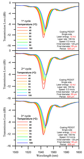We also conducted control experiments (the temperature sensitivity of an LPFG without PEDOT:PSS). Wavelength shift and transmission loss sensitivity over three temperature test cycles under LPFG (D = 65 μm, Λ = 620 μm) coated with PEDOT:PSS and LPFG (D = 65 μm, Λ = 620 μm) without PEDOT:PSS (Figure 8) are similar. However, the LPFG sensor without PEDOT:PSS frequently broke during temperature detection. The polymer plays the role of a protective layer for the sensor, and the polymer can expand and contract with temperature changes during temperature measurement. Therefore, the result can reach similar sensitivity.