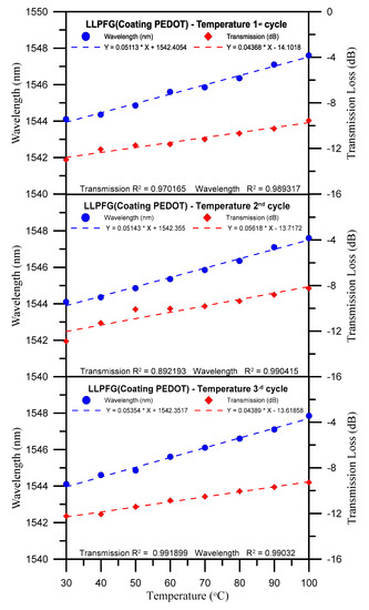 Our study proposed a PEDOT:PSS-coated LLPFG sensor with a diameter of 65 μm and a period of 620 μm and subjected it to three temperature test cycles with the aim of investigating the sensor’s wavelength shifts and transmission losses when exposed to temperatures between 30 and 100 °C. The experimental results proved that when the PEDOT:PSS-coated LLPFG sensor was subjected to a rising temperature, its wavelength position gradually shifted to a longer wavelength (the average wavelength shift was 4 nm) and its transmission loss was reduced. As demonstrated in the chart and tables above, the sensor’s average wavelength sensitivity and average wavelength shift linearity were 0.052 nm/°C and 99%, respectively; its average transmission sensitivity and average transmission loss linearity were 0.048 (dB/°C) and 95%, respectively. These experimental results indicate that this type of PEDOT:PSS-coated LLPFG sensor offers high sensitivity and reproducibility, and for this reason, a coating consisting of PEDOT:PSS and other polymeric materials could be applied to LLPFG sensors to increase their sensitivity and to enable various parameters to be designed and measured.