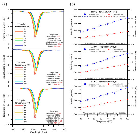 Linearity of wavelength shift and transmission loss over three temperature cycles under LPFG (D = 65 μm, Λ = 620 μm).