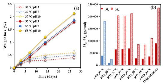Hydrolytic degradation of commercial P4HB sutures was evaluated through weight loss and molecular weight measurements using media of three different pH values (i.e., acidic, neutral, and basic) and two temperatures (i.e., 37 and 55 °C that are associated to physiological conditions and the higher available temperature before starting fusion, respectively).