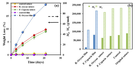 (a) Weight loss versus exposure time for P4HB sutures exposed to the indicated enzymatic media. Results are also plotted for the control and a melt pressed film (right vertical axis, dashed arrow) exposed to the Rhizopus oryzae medium for 21 days. (b) Mn (full bars) and Mw (weave bars) molecular weights of the initial suture, the control and sutures after exposure for 21 days to the indicated enzymatic media. For the sake of completeness, the results obtained from a melt pressed film are also depicted (blue bars).