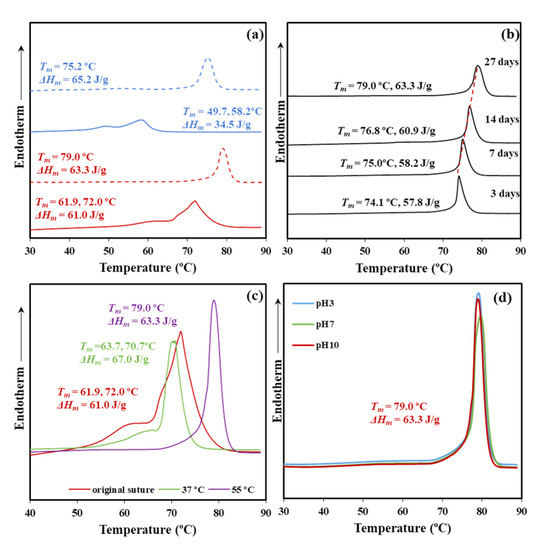 (a) DSC heating scans (10 °C/min) corresponding to a melt pressed film (blue) and the commercial suture (red) before exposure (solid line) and after exposure (dashed line) for 27 days to a pH 10 hydrolytic medium at 55 °C. (b) DSC heating runs of commercial sutures exposed for the indicated days to a pH 10 medium at 55 °C. (c) DSC heating runs of commercial sutures exposed at a pH 10 medium for 27 days and temperatures of 37 and 55 °C. For the sake of completeness, the curve for the commercial suture is also drawn. (d) DSC heating runs of commercial sutures exposed at pH 3, pH 7, and pH 10 media for 27 days and 55 °C.
