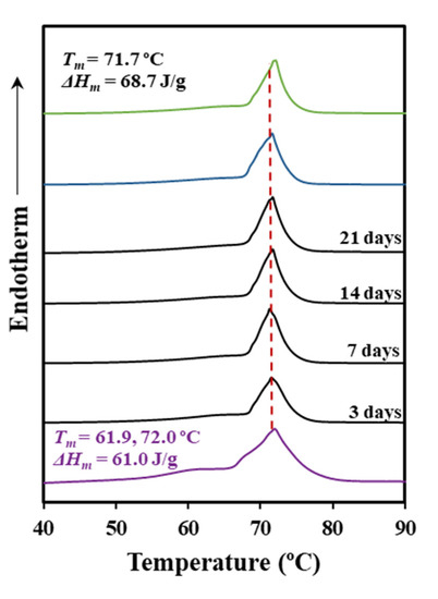 The influence of the degradation time on the melting point is displayed in Figure 3b for the high temperature and the less pH aggressive conditions. A progressive increase of the melting point with the exposure time is clearly detected (i.e., from 74.1 to 79.0 °C for three and 27 days, respectively), as well as an increase of the melting enthalpy (i.e., from 57.8 to 63.3 J/g). The observation demonstrates that the crystalline lamellar thickness increases during degradation probably because of some chain breakages in the amorphous lamellar folding surfaces.