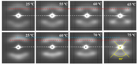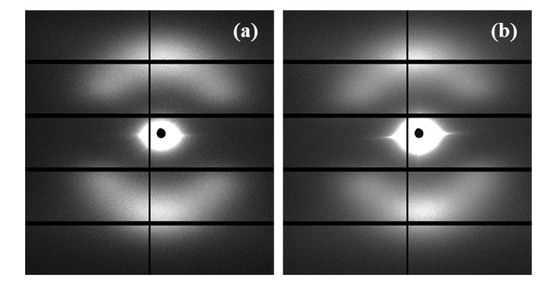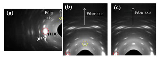 Molecular chains in the crystalline lamellae remained aligned with the longitudinal direction of sutures, even those crystals with tilted surfaces. All observed reflections in WAXD patterns (Figure 8) were in agreement with the published orthorhombic unit cell of P4HB [16,17]. Specifically, (110) and (020) reflections at 0.388 and 0.406 nm appeared as very small arcs in the equator.
