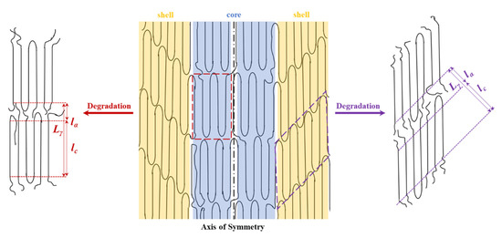 Scheme showing the structure of annealed fibers characterized by the presence of two types of lamellar crystals that are part of the shell and the core before and after being submitted to hydrolytic degradation.