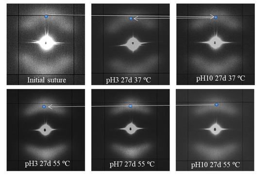 The microstructure of sutures changed during hydrolytic degradation as can be deduced from the SAXS pattern (Figure 7b) of the sample exposed to the more aggressive conditions (i.e., pH3, 55 °C, and 27 days). Basically, differences concerning the meridional spots associated to the more imperfect crystals are placed in the core. Thus, the interlamellar spacing slightly increased (from 14.1 to 14.8 nm) as the reflections slightly moved to the center of the pattern. Furthermore, the intensity of these spots increased suggesting a higher electronic contrast between crystalline and amorphous layers. In this way, degradation mainly affected the more defective crystals, causing some molecular breakages on their folding surface. A slight reordering was produced leading to the observed increase of the crystalline lamellar thickness, while simultaneously the amorphous layer became less compact and more disordered.