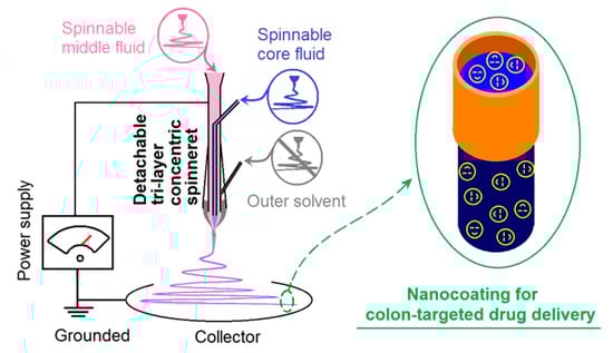 - Yu, D.-G.; Wang, M.; Li, X.; Liu, X.; Zhu, L.-M.; Bligh, S.W.A. Multifluid electrospinning for the generation of complex nanostructures. Wiley Interdiscip. Rev. Nanomed. Nanobiotechnol. 2020, 12, e1601. [Google Scholar] [CrossRef]
