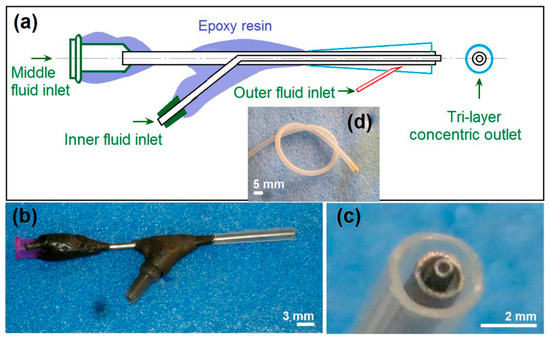 The detachable tri-layer concentric spinneret: (a) The design details of the spinneret with three inlets for the three working fluids and a common tri-layer concentric outlet; (b) a digital picture of the full view of the spinneret; (c) a digital image of the tri-layer concentric outlet. (d) A sharp needle with a highly elastic silica tubing for transferring the outer solvent, which has an outer diameter and a wall thickness of 0.3 and 0.05 mm, respectively.