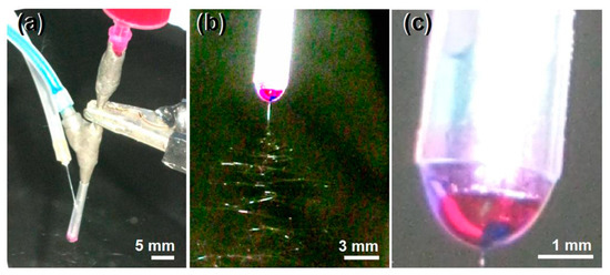 Shown in Figure 3a is a digital image of the connections of three working fluids and the high voltage with the spinneret. The plastic syringe holding the middle fluid was directly inserted into the tri-layer concentric spinneret. The core drug-ES100 co-dissolving solution was guided to the spinneret through an elastic silicon tubing. The outer layer solvent was led to the spinneret through a sharp needle, which could penetrate into the PP tapering tube. The high-voltage electrical energy was converted to the working fluid through an alligator clip. Under the optimized conditions, a typical working process for creating the CSFs is shown in Figure 3b. The classic three steps of electrospinning can be clearly discerned, i.e., the Taylor cone, the straight fluid jet, and the whipping and bending loops with a gradual increase in diameter due to electric repelling. The compound Taylor cone is exhibited in Figure 3c, in which the blue core layer was encapsulated by the red middle layer, and, in turn, encapsulated by the outer solvent mixture layer. A strange phenomenon is the color of the outer layer solvent mixture, which should be slightly blue. However, the diffusion of the red basic fuchsin molecules from the middle ES100 solution made a very light purple color.