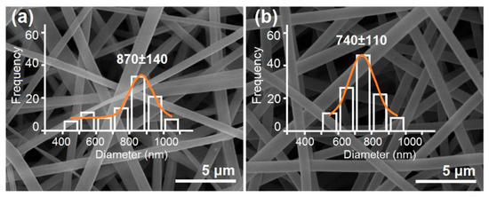 The SEM features of the MCFs and the CSFs created using the modified triaxial electrospraying are shown in Figure 4a,b, respectively. It is clear that all the nanofibers have a smooth surface and a fine linear morphology free of beads-on-a-string or spindles-on-a-string phenomena. The reasons should be attributed to the fine electrospinnability of ES100 solutions under the selected working conditions. The MCFs had an average diameter of 870 ± 140 nm by estimation, and, by contrast, the CSFs had an average diameter of 740 ± 110 nm. Although the total fluid flow rates of the modified tri-axial electrospinning are larger than the fluid flow rate of the monoaxial single-fluid process, the CSFs had a smaller diameter than the MCFs. The reasons should be attributed to the following two reasons. One is that the outer solvent mixture was able to effectively retard the formation of the semi-solid substance around the fluids’ jets, and thus keep them from being drawn under the electrical field for a longer time period [63]. The other is that the applied voltage for creating the CSFs was slightly higher than that for producing the MCFs.