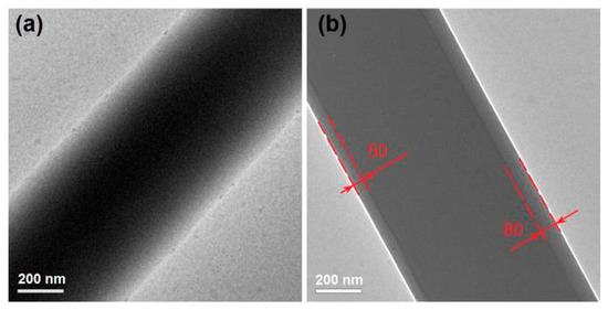The TEM images of the prepared MCFs using single-fluid blended electrospraying and the CSFs created using the modified triaxial electrospraying are shown in Figure 5a,b, respectively. Just as anticipated, the MCF nanofiber has a monolithic composite feature with the aspirin molecules highly homogeneously distributed all over the ES100 matrices. This can be reflected by the gradual change in gray level from the fiber’s center to the boundary, which is a direct result of the thicknesses of different places at the nanofiber. The CSF nanofiber has an obvious core–shell nanostructure, which has an average thickness of (80 + 50)/2 = 65 nm. The core section has an estimated diameter of 580 nm.