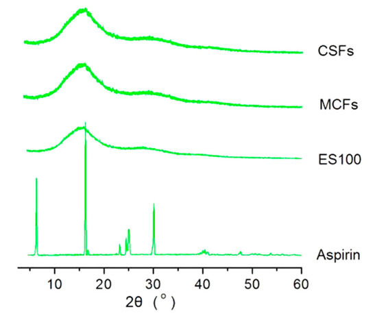The XRD patterns of the crude materials ES100, aspirin, and their nanofibers MCFs and CSFs are included in Figure 6. The curve of aspirin indicates that the crude white aspirin powders are typically crystalline due to the sharp peaks in its patterns. These sharp peaks are Bragg responses that reflect X-ray beams at certain angles of incidence (θ), verifying the presence of lattice planes and in turn the polycrystalline property of aspirin powders. The filament-forming matrix ES100 has no sharp peaks except two blunt halos, giving a hint that it is an amorphous material. The nanofibers MCFs and CSFs from the two different electrospinning processes have a similar XRD curve, just as the pattern of ES100. These phenomena suggest that all the aspirin molecules are converted into an amorphous state to co-exist with the ES100 molecules in the two types of nanofibers.