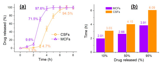 From another angle, the advantages of CSFs over MCFs can be seen in Figure 8b. A percentage of 10% release costs MCFs and CSFs 2.01 and 3.03 h, respectively. CSFs have the better delayed-release effect after possible oral administration. A percentage of 50% and 95% costs MCFs 2.66 and 3.91 h, respectively. By comparison, the time periods for CSFs are 4.15 and 6.09 h, considerably better than those for MCFs in terms of sustained-release time periods.