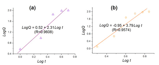 where Q represents the accumulative release percentage of aspirin, t represents the release time, k is a constant, and the power n is an important parameter to indicate the drug release mechanism. Often, when the n value is smaller than 0.45, it is suggested that the drug molecules are released by a typical Fickian mechanism. By contrast, when the n value is larger than 0.9, the drug is regarded to be released through an erosion mechanism. A value of n between 0.45 and 0.90 indicates a combined mechanism of diffusion and erosion. The regressed equation for MCFs is LogQ = 0.52 + 2.31 Logt (R = 0.9608) (Figure 9a). A bigger n value of 2.31 > 0.90 suggests that aspirin released from the MCFs through an erosion mechanism, i.e., the release of aspirin is controlled by the dissolution or erosion rates of ES100. The regressed equation for CSFs is LogQ = −0.95 + 3.79Logt (R = 0.9574). Similarly, a bigger n value of 3.79 > 0.90 suggests that aspirin released from the CSFs also through an erosion mechanism. This suggests that the shell ES100 layer has no influence on the drug release mechanism.