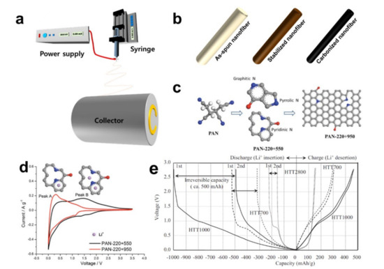 - Lee, B.-S.; Yang, H.-S.; Jung, H.; Mah, S.K.; Kwon, S.; Park, J.-H.; Lee, K.H.; Yu, W.-R.; Doo, S.-G. Facile method to improve initial reversible capacity of hollow carbon nanofiber anodes. Eur. Polym. J. 2015, 70, 392–399. [Google Scholar] [CrossRef]