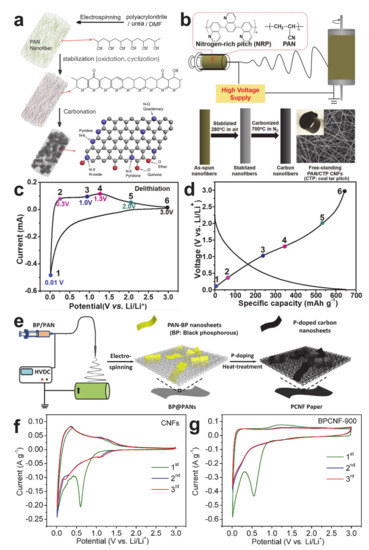 - Li, D.; Wang, D.; Rui, K.; Ma, Z.; Xie, L.; Liu, J.; Zhang, Y.; Chen, R.; Yan, Y.; Lin, H.; et al. Flexible phosphorus doped carbon nanosheets/nanofibers: Electrospun preparation and enhanced Li-storage properties as free-standing anodes for lithium ion batteries. J. Power Sources 2018, 384, 27–33. [Google Scholar] [CrossRef]