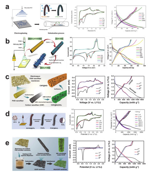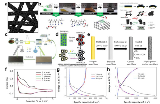 - Wang, T.; Shi, S.; Li, Y.; Zhao, M.; Chang, X.; Wu, D.; Wang, H.; Peng, L.; Wang, P.; Yang, G. Study of Microstructure Change of Carbon Nanofibers as Binder-Free Anode for High-Performance Lithium-Ion Batteries. ACS Appl. Mater. Interfaces 2016, 8, 33091–33101. [Google Scholar] [CrossRef] [PubMed]