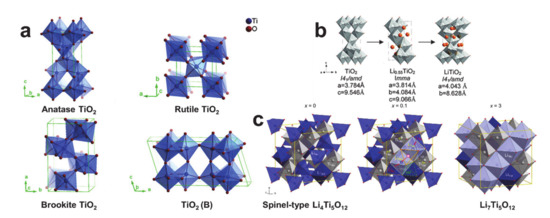 - Lafont, U.; Carta, D.; Mountjoy, G.; Chadwick, A.V.; Kelder, E.M. In Situ Structural Changes upon Electrochemical Lithium Insertion in Nanosized Anatase TiO2. J. Phys. Chem. C 2010, 114, 1372–1378. [Google Scholar] [CrossRef]