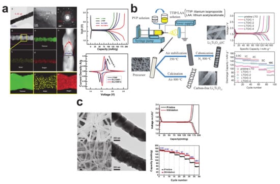 - Sandhya, C.P.; John, B.; Gouri, C. Synthesis and electrochemical characterisation of electrospun lithium titanate ultrafine fibres. J. Mater. Sci. 2013, 48, 5827–5832. [Google Scholar] [CrossRef]