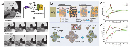 - Nie, A.; Gan, L.-Y.; Cheng, Y.; Asayesh-Ardakani, H.; Li, Q.; Dong, C.; Tao, R.; Mashayek, F.; Wang, H.-T.; Schwingenschlögl, U.; et al. Atomic-Scale Observation of Lithiation Reaction Front in Nanoscale SnO2 Materials. ACS Nano 2013, 7, 6203–6211. [Google Scholar] [CrossRef] [PubMed]
