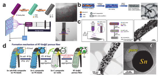 - Lee, J.H.; Oh, S.H.; Jeong, S.Y.; Kang, Y.C.; Cho, J.S. Rattle-type porous Sn/C composite fibers with uniformly distributed nanovoids containing metallic Sn nanoparticles for high-performance anode materials in lithium-ion batteries. Nanoscale 2018, 10, 21483–21491. [Google Scholar] [CrossRef]