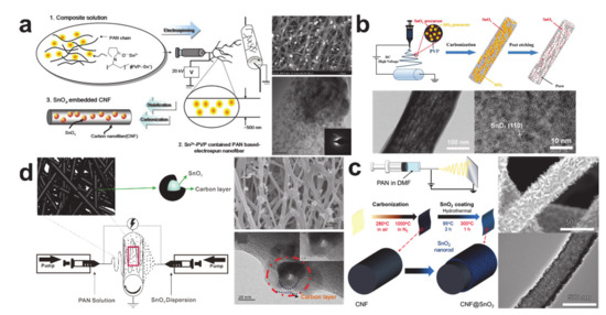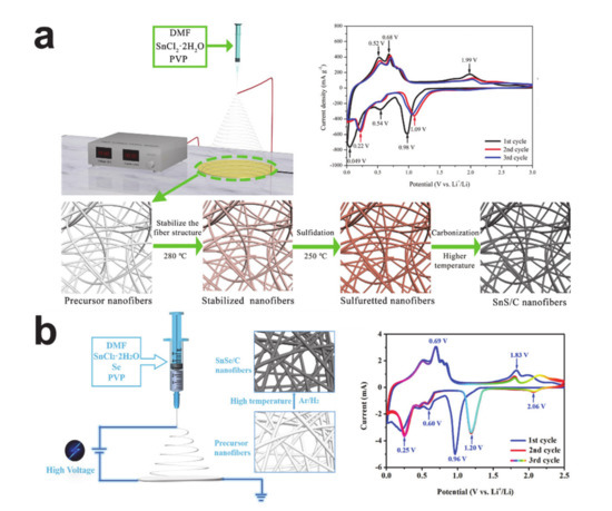 - Wang, W.; Liang, Y.; Kang, Y.; Liu, L.; Xu, Z.; Tian, X.; Mai, W.; Fu, H.; Lv, H.; Teng, K.; et al. Carbon-coated SnO2@carbon nanofibers produced by electrospinning-electrospraying method for anode materials of lithium-ion batteries. Mater. Chem. Phys. 2019, 223, 762–770. [Google Scholar] [CrossRef]