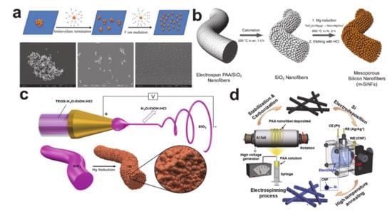 - Lee, D.J.; Lee, H.; Ryou, M.-H.; Han, G.-B.; Lee, J.-N.; Song, J.; Choi, J.; Cho, K.Y.; Lee, Y.M.; Park, J.-K. Electrospun Three-Dimensional Mesoporous Silicon Nanofibers as an Anode Material for High-Performance Lithium Secondary Batteries. ACS Appl. Mater. Interfaces 2013, 5, 12005–12010. [Google Scholar] [CrossRef] [PubMed]