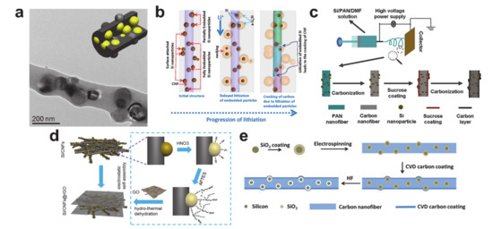- Wang, L.; Ding, C.X.; Zhang, L.C.; Xu, H.W.; Zhang, D.W.; Cheng, T.; Chen, C.H. A novel carbon–silicon composite nanofiber prepared via electrospinning as anode material for high energy-density lithium ion batteries. J. Power Sources 2010, 195, 5052–5056. [Google Scholar] [CrossRef]