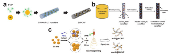 - Fan, X.; Zou, L.; Zheng, Y.-P.; Kang, F.-Y.; Shen, W.-C. Electrospinning Preparation of Nanosilicon/Disordered Carbon Composite as Anode Materials in Li-Ion Battery. Electrochem. Solid-State Lett. 2009, 12, A199. [Google Scholar] [CrossRef]