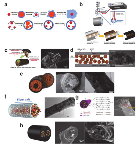 - Zhang, H.; Qin, X.; Wu, J.; He, Y.-B.; Du, H.; Li, B.; Kang, F. Electrospun core–shell silicon/carbon fibers with an internal honeycomb-like conductive carbon framework as an anode for lithium ion batteries. J. Mater. Chem. A 2015, 3, 7112–7120. [Google Scholar] [CrossRef]