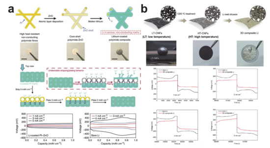 - Liang, Z.; Lin, D.; Zhao, J.; Lu, Z.; Liu, Y.; Liu, C.; Lu, Y.; Wang, H.; Yan, K.; Tao, X.; et al. Composite lithium metal anode by melt infusion of lithium into a 3D conducting scaffold with lithiophilic coating. Proc. Natl. Acad. Sci. USA 2016, 113, 2862. [Google Scholar] [CrossRef]