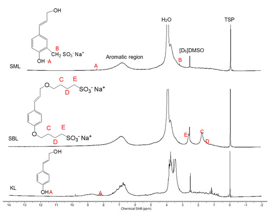 1H–NMR Spectra of kraft lignin (KL), sulfomethylated lignin (SML), and sulfobutylated lignin (SBL) in [D6]DMSO.