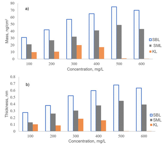 Adsorption of KL, SBL, and SML at different concentrations (a) Mass uptake (b) Thickness.