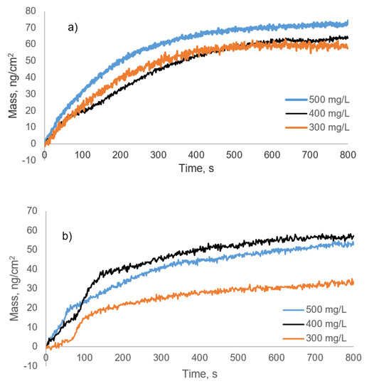 Figure 6 shows the final adsorbed mass and thickness determined from the changes in the frequency using the Sauerbrey Equation for different concentrations of lignin solutions. KL had the lowest adsorbed mass and thickness at all concentrations when compared with SBL and SML, implying the limited affinity of KL for adsorption on the surface at pH 7.8. For all concentrations, the adsorbed mass and thickness for SBL were higher than SML confirming that the higher molecular weight lignin derivative adsorbed more than the lower molecular weight one on the surface [44,45]. The maximum mass uptakes for both SBL and SML (74.71 ng/cm2 and 49.54 ng/cm2, respectively) were observed at the concentration of 500 mg/L, and this concentration was considered as the saturation concentration for the adsorption of both lignin derivatives onto the Al2O3 surface. Moreover, the higher Mw and longer and softer alkyl chains of SBL than SML caused a better anchoring effect [26] (Figure 1) resulting in higher mass uptake of SBL on the surface (Figure 6a). However, increasing the concentration to 600 mg/L dropped the adsorbed mass of all lignin derivatives. This behavior is attributed to the competitive occupancy and the repulsive interaction between the excess molecules [46] that could hinder the adsorption.