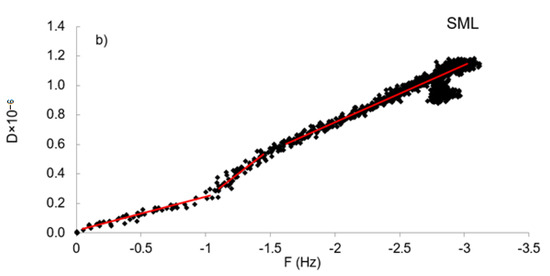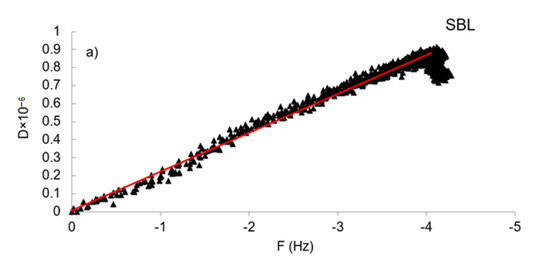 The changes in the slopes of ΔD/ΔF plots were investigated and presented in Figure 8 for the concentration of 500 mg/L, and for concentrations of 300 and 400 mg/L in Figure S7 in the supporting information file. The absolute values for the slopes of ΔD/ΔF plots were presented as K values in Table S4 in the supporting information file for making quantitative distinctions for the properties of adsorbed layers. The plot for SBL (Figure 8a) was linear during the whole adsorption process, which indicates that no conformational rearrangement was observed for the SBL molecules as more mass adsorbed on the surface [43]. For SML, at the first stage of adsorption, the plot started with a small K value indicating a rigid adlayer (Figure 8b; Table S4), but the slope of the second region (K2) was considerably steeper than the initial slope, signaling more dissipation per adsorbed molecule [46]. Possibly, conformational changes and water adsorption alter the flexibility of the adsorbed layer, and the change of dissipation arises [51]. The observation of conformational rearrangement for SML is in good agreement with the kinetic data (Table 2), as the reorientation step causes a deviation from pseudo-first-order kinetics. The slope in the reorientation step of SML was steeper than the slope for SBL, illustrating that the molecules of SML exhibited a more extended configuration from the surface forming a more irregular layered film [35], presumably due to higher hydrophilicity of SML. In the saturation region of SML adsorption, a smaller slope, K3, was observed (Table S4), due to the departure of entrapped water molecules from the adlayer by adsorbed polymer molecules as the adsorption continued leading to a more compact film on the surface [44].