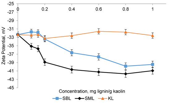 The zeta potential of kaolin particles is an important parameter of suspensions as it represents the strength of the electrostatic repulsive interaction between particles [8]. The kaolin particles with the surface area of 24.16 m2/g and a particle size of 7.96 μm were used in this study. Figure 9 shows the effect of KL, SBL, and SML on the zeta potential of kaolin suspensions at different concentrations. KL insignificantly affected the zeta potential of kaolin suspensions. However, with the addition of sulfoalkylated lignins, the zeta potential of the suspension became more negative [52]. The minimum zeta potential values were obtained at the dosage 0.8 mg/g of kaolin (−40 and −42 mV for the SBL and SML, respectively). It is also apparent that the SML reduced the zeta potential of the suspension more greatly. The difference in the zeta potential values for sulfoalkylated lignins with similar charge densities could stem from the thicknesses of adsorbed layers of sulfoalkylated lignins. As seen from the results in Figure 6b, the total adlayer for SML is thinner than SBL for all concentrations. The thinner adsorbed layer of SML could cause a more negative zeta potential as a thinner electrical double layer favors a negative zeta potential [52]. In another study, an increase in the zeta potential of kaolin suspensions was higher for a linear polymer with a thinner adsorbed layer on a particle [12]. The configuration types of lignin derivatives on the surfaces could have an impact on the negativity of the zeta potential. As discussed in Section 3.6.2., SBL formed a more rigid adlayer, while SML had a more extended configuration on the surface. A more compact configuration on the surface could diminish the number of free chains available to interact with the surface, whereas an extended polymer chain could facilitate the electrostatic interactions between charged groups on the polymer backbone and the surface [53,54]. In a former study, polymers adsorbed on the kaolin surface with a more extended configuration and impacted the value of zeta potential more greatly [55].