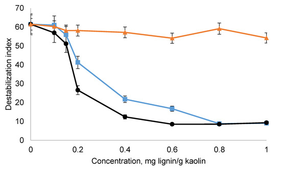 Figure 10 shows the destabilization index of kaolin suspensions in the presence of lignin derivatives. KL could not disperse the suspension, but the other lignin derivatives reduced the instability of the suspension greatly. This improvement in the stability of kaolin suspension is due to the electrostatic repulsion generated between the particles (Figure 9) by the adsorption of lignin derivatives (Figure 6). As SML affected the zeta potential more greatly (Figure 9), it impacted the instability of the suspension more sensibly. It is also apparent that the higher molecular weight of SBL did not promote its dispersion performance. In a previous study, the effect of the molecular weight of oxidized lignin on the performance of kaolin dispersion was investigated [31].